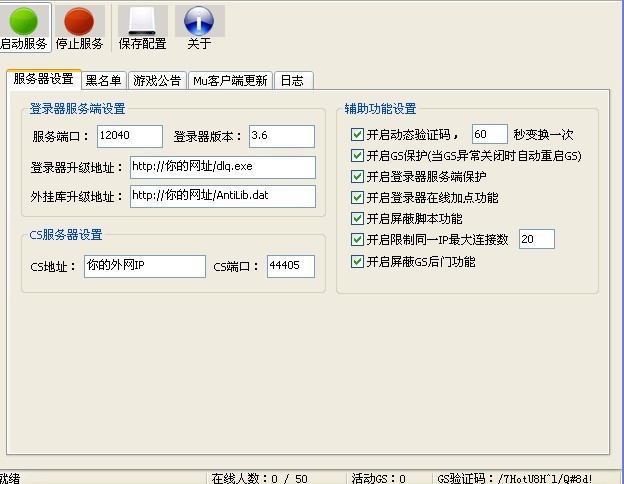 LaoM2网络奇迹MU卫士3.6商业登陆器一、登录器服务器配置:1、服务器端口:默认为12040 (一般不需要修改,和客户端的端口一致即可。此端口要对外开放)2、登录器版本:和客户端的版本一致,